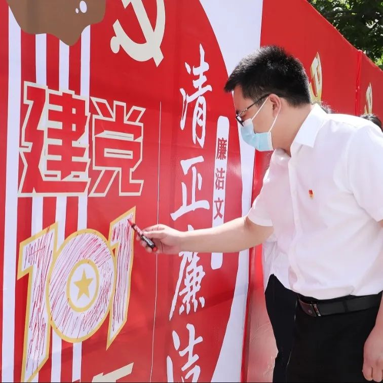 宣誓后,党员们分别拿起红色画笔,共同将“101”数字填满,以此庆祝伟大的党101岁生日快乐。